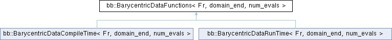 All methods are constexpr. For native field types (bb::field) they are evaluated at compile time; for non-constexpr types (e.g. stdlib field_t) the constexpr qualifier is silently ignored and they execute at runtime. The two thin wrapper classes (BarycentricDataCompileTime, BarycentricDataRunTime) inherit these methods and only differ in how they declare their static data members (static constexpr vs inline static const).